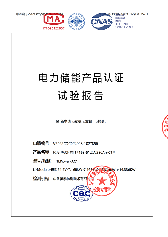 Electric energy storage product certification test report